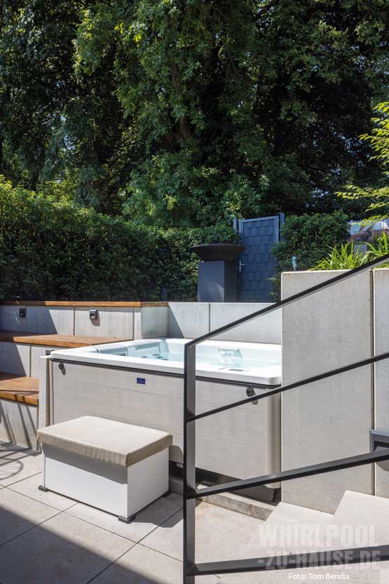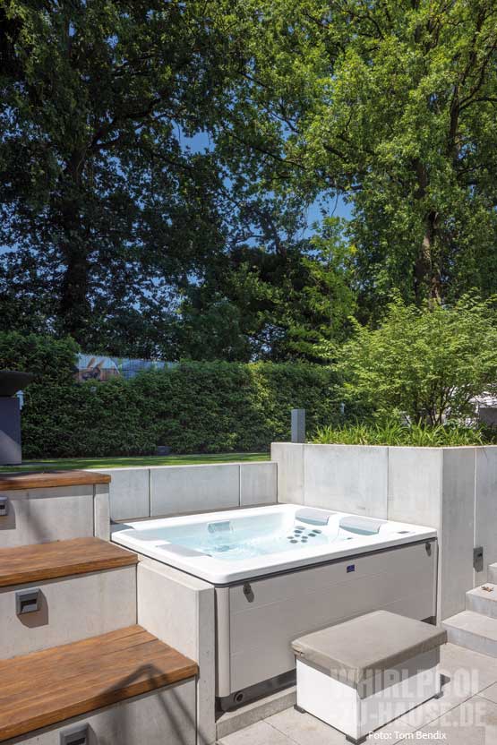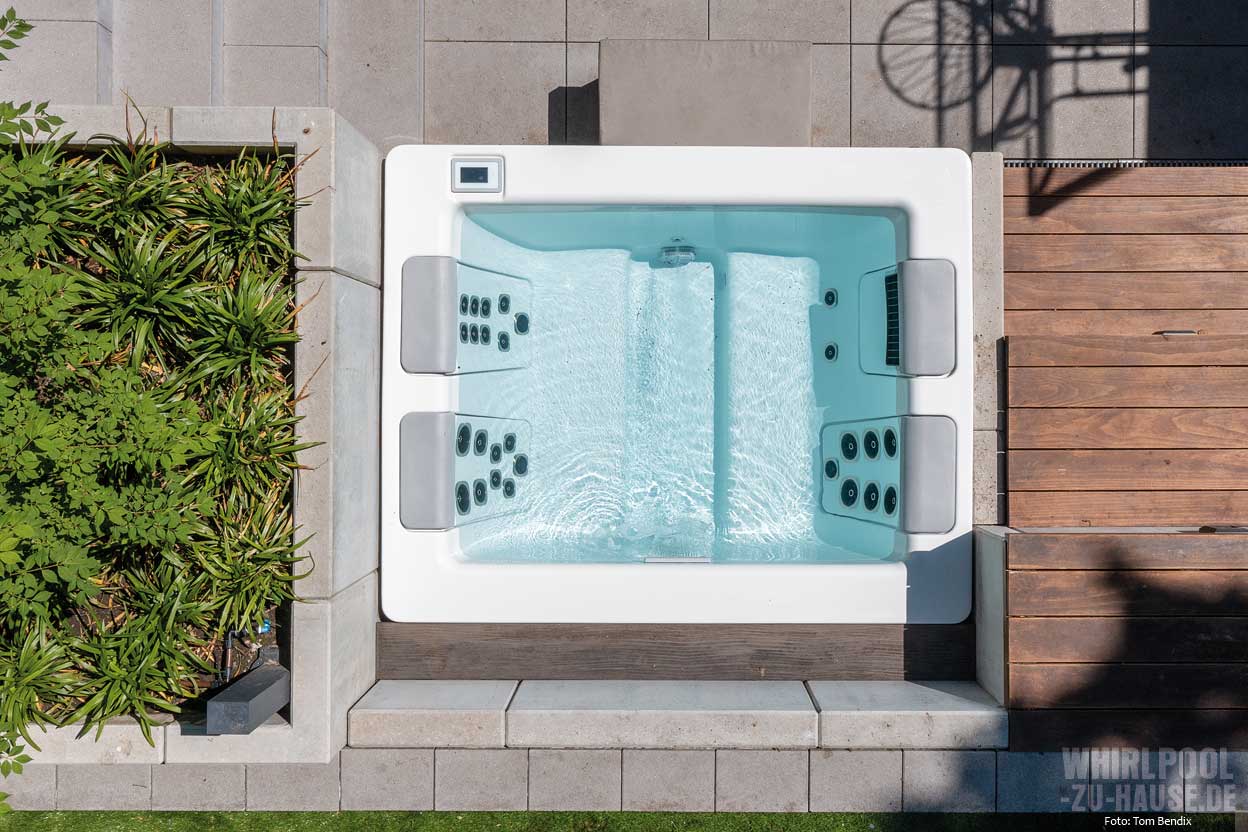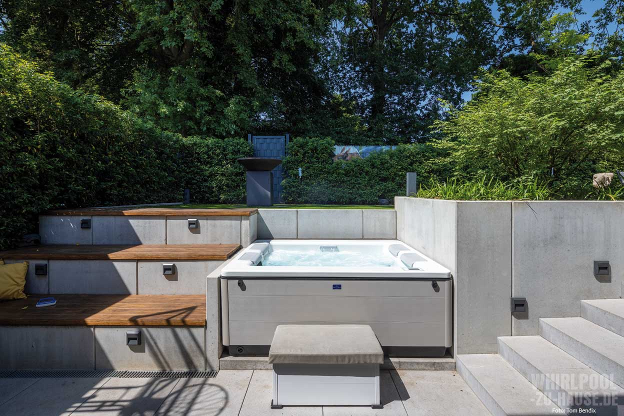 Mit seiner klaren kubistischen Form passt der „Just Silence Compact“ zum Stil moderner Wohnwelten und ist auch optisch ein Highlight. In der Farbe Light Grey fügt er sich hier nahtlos in seine Umgebung ein, wobei die Nischenplatzierung den Badenden außerdem einen gewissen Windschutz bietet. Eine clevere Lösung zum Relaxen sind die mit einer Holzoberfläche versehenen Terrassenabsätze, die als Daybeds dienen.