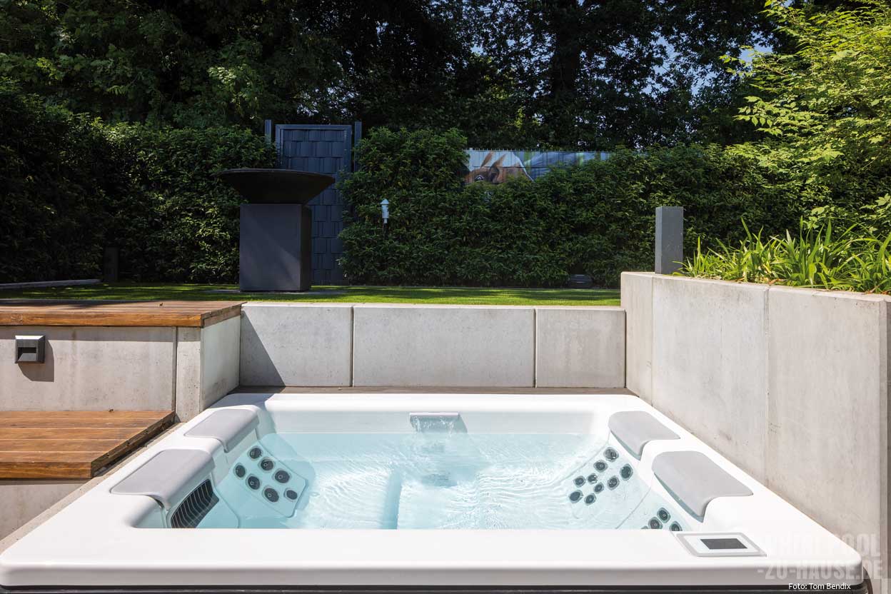 Um den eigenen Garten in eine Wellnessoase zu verwandeln, braucht es nicht viel Platz. Ein Whirlpool lässt sich kompakt in eine Nische auf der Terrasse oder auf einem Plätzchen im Freien integrieren und ist ein Ruhepol, der uns eine Auszeit vom Alltag schenkt. Wellness und Entspannung waren auch die Gründe, warum sich diese Familie zusätzlich zur bestehenden Schwimmhalle noch einen Whirlpool anschaffte.