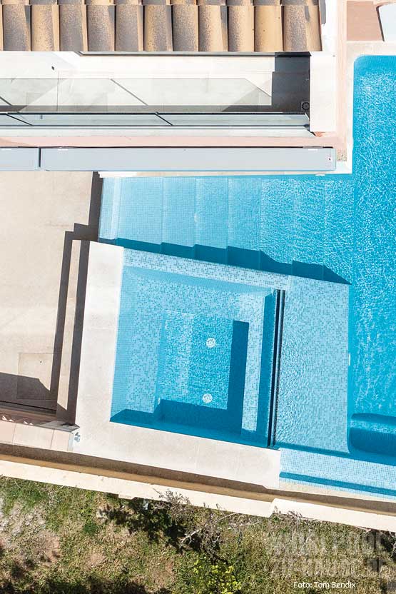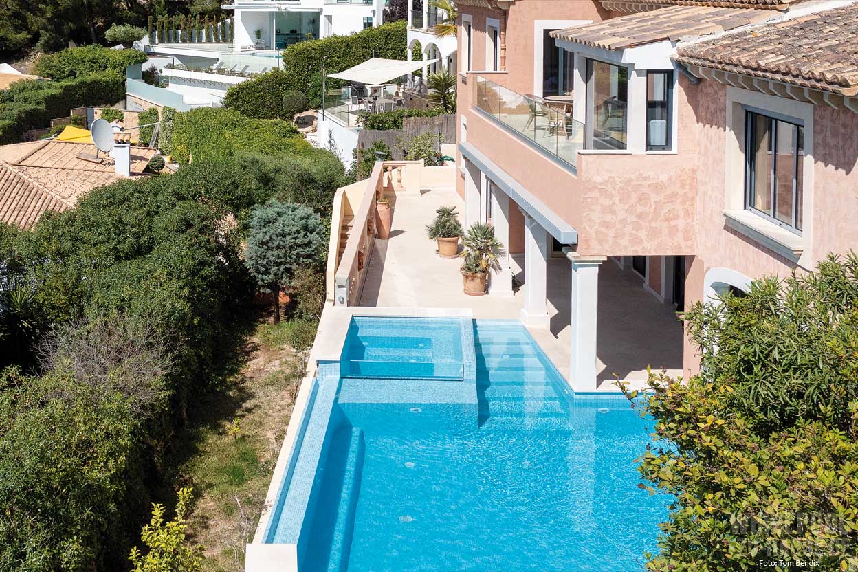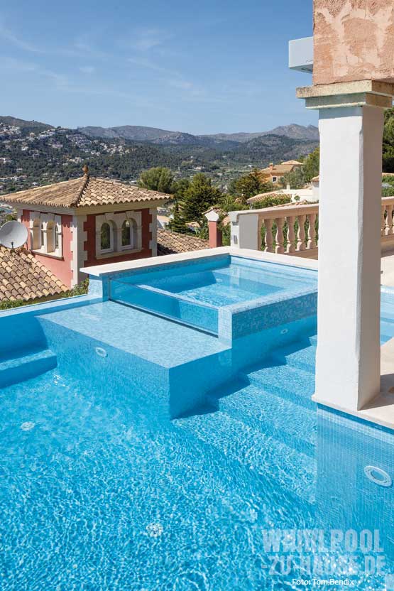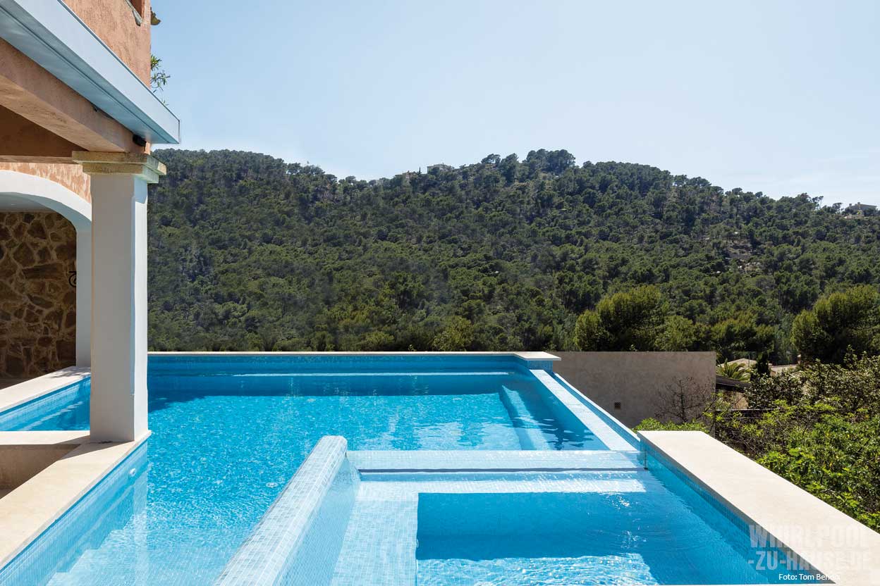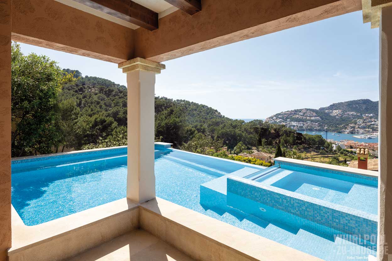 Sechs breite, mit blauen Mosaiksteinen ausgekleidete Treppenstufen führen in den 6 x 7 Meter großen Swimming Pool, dessen Außenkante mit einem Infinity-Überlauf versehen ist. So hat man während des Schwimmens den Hafen immer im Blick. Doch nicht nur das tägliche Schwimmtraining, das dank einer leistungsstarken Gegenstromanlage realisiert worden ist, lag diesem Bauherrn am Herzen. Auch ein anschließendes Entspannungsbad für die beanspruchten Muskeln stand ganz oben auf der Wunschliste, als er auf eine Empfehlung mit seinen Ideen den Schwimmbadprofi Jens Langer von Sun Pool auf Mallorca aufsuchte.