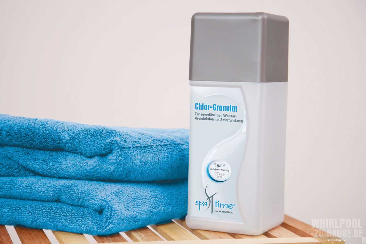 Beide Methoden reduzieren auch den Bedarf an zusätzlichen Wasserpflegemitteln, ganz darauf verzichten können Sie aber dennoch nicht. Das bekannteste Mittel für hygienisch einwandfreies Wasser ist Chlor, das in Form von Tabletten oder Granulat zugegeben wird. Da die Dosiermenge vom Chlorgehalt des Wassers abhängt, sollte dieser einmal pro Woche mit entsprechenden Teststreifen – zum Beispiel aus dem SpaTime-Sortiment von Bayrol – überprüft werden. Der ideale Chlorwert liegt bei 1,0 bis 1,5 Milligramm pro Liter.