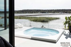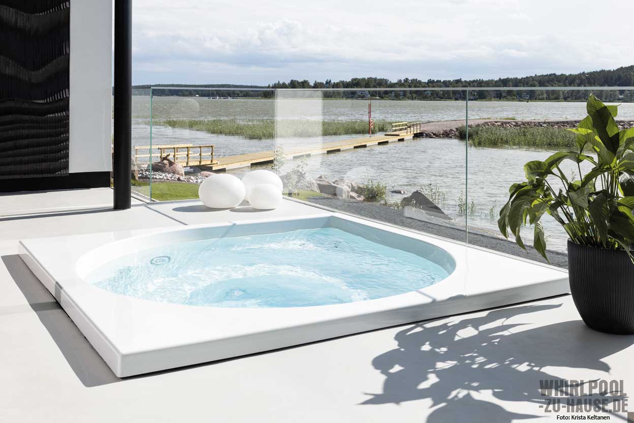 Die klaren Linien und das minimalistische Design des Whirlpools passen perfekt zur Architektur der „Villa Havet”. „Wir wollten einen Whirlpool, der nicht nur gut aussieht, sondern auch langlebig und nachhaltig ist“, erklärt Lehtonen. Der in Finnland entworfene und hergestellte Whirlpool fügt sich nahtlos in den Außenbereich ein, ohne die Ästhetik des Hauses zu stören.