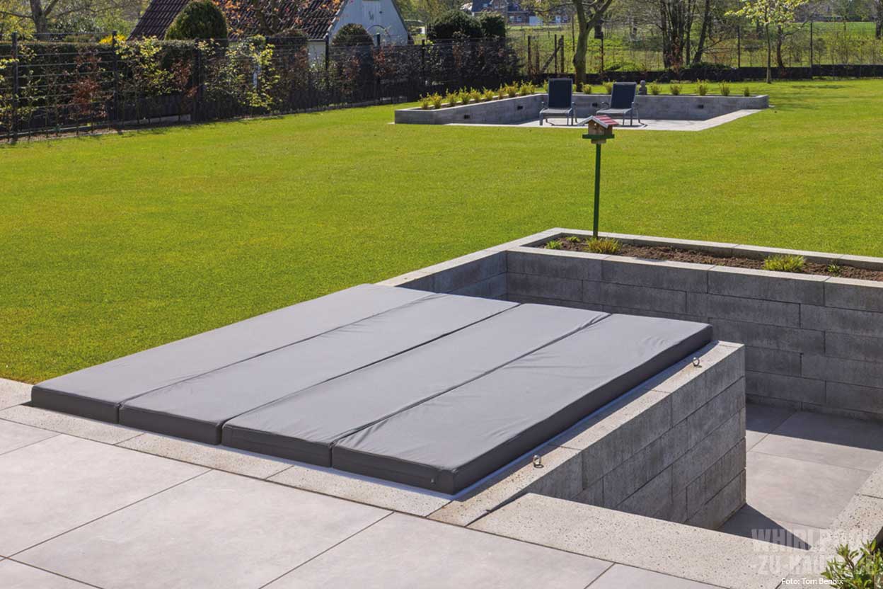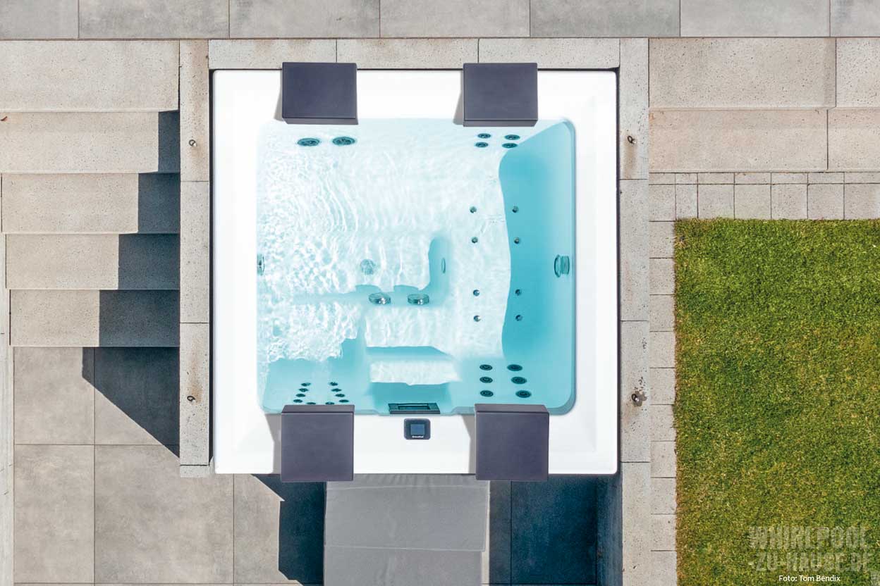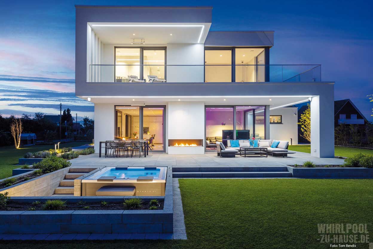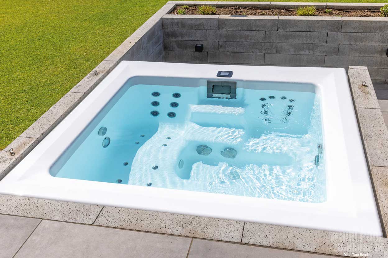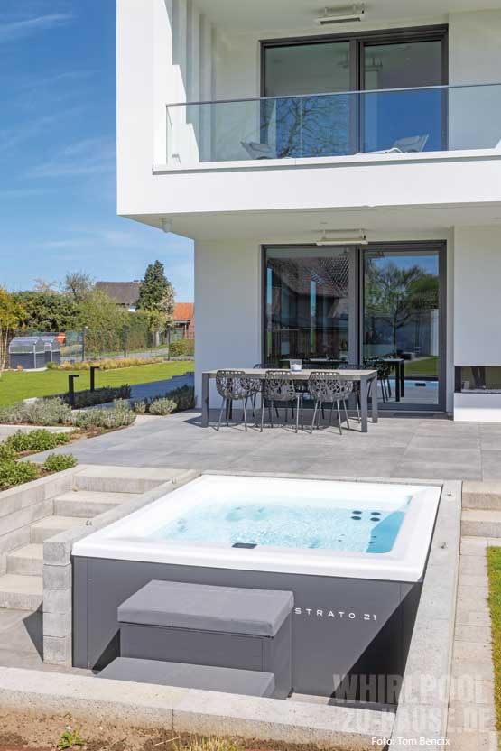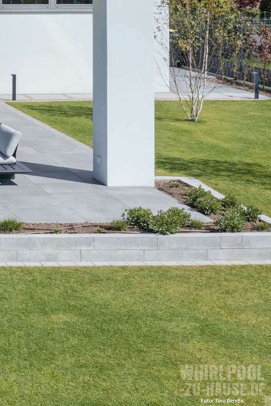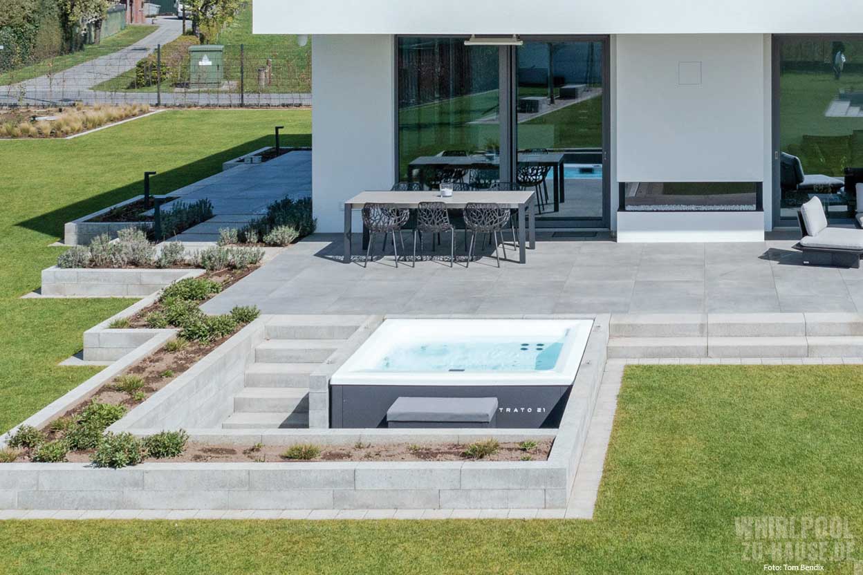 Besonderes Augenmerk legte man auf die Einbringung des Whirlpools. Damit sich dieser optisch in die bestehende Terrasse einfügt, gleichzeitig jedoch auch eine eigene Einheit bildet, ließ der Bauherr eine quadratische Einfriedung etwas unterhalb der Sonnenterrasse errichten. Sie fasst den „Strato 2.1“ nun von drei Seiten ein. Auf der zum Garten zeigenden Seite befinden sich die Einstiegstreppen, die sicher ins wohltuend warme Wasser führen. Sitzen der Bauherr und seine Familie nun im Whirlpool haben Sie den Garten bestens im Blick.